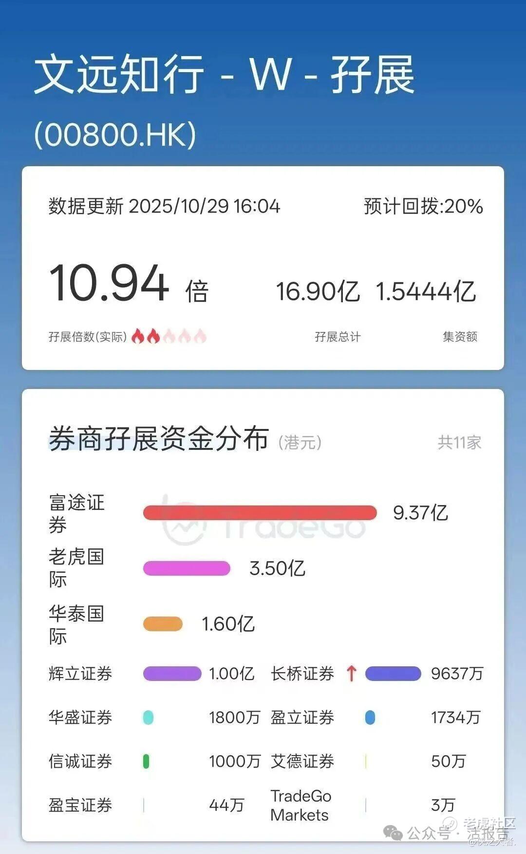 据捷利交易宝的新股孖展数据,截至10月29日17时,文远知行-W首日的孖展总额约16.90亿港元,孖展认购倍数约10.94倍。其中,富途证券、老虎国际、华泰国际放出9.37亿、3.50亿、1.60亿港元。