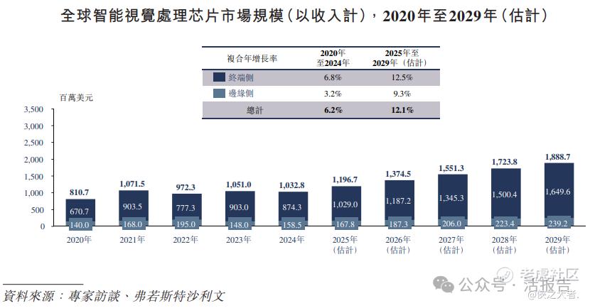 根据弗若斯特沙利文(Frost & Sullivan)的报告,2020年全球智能视觉处理芯片市场整体规模为810.7百万美元,以6.2%的CAGR在2024年增长至1,032.8百万美元,预计2029年将增长至1,888.7百万美元,2025-2029年CAGR进一步提升至12.1%。