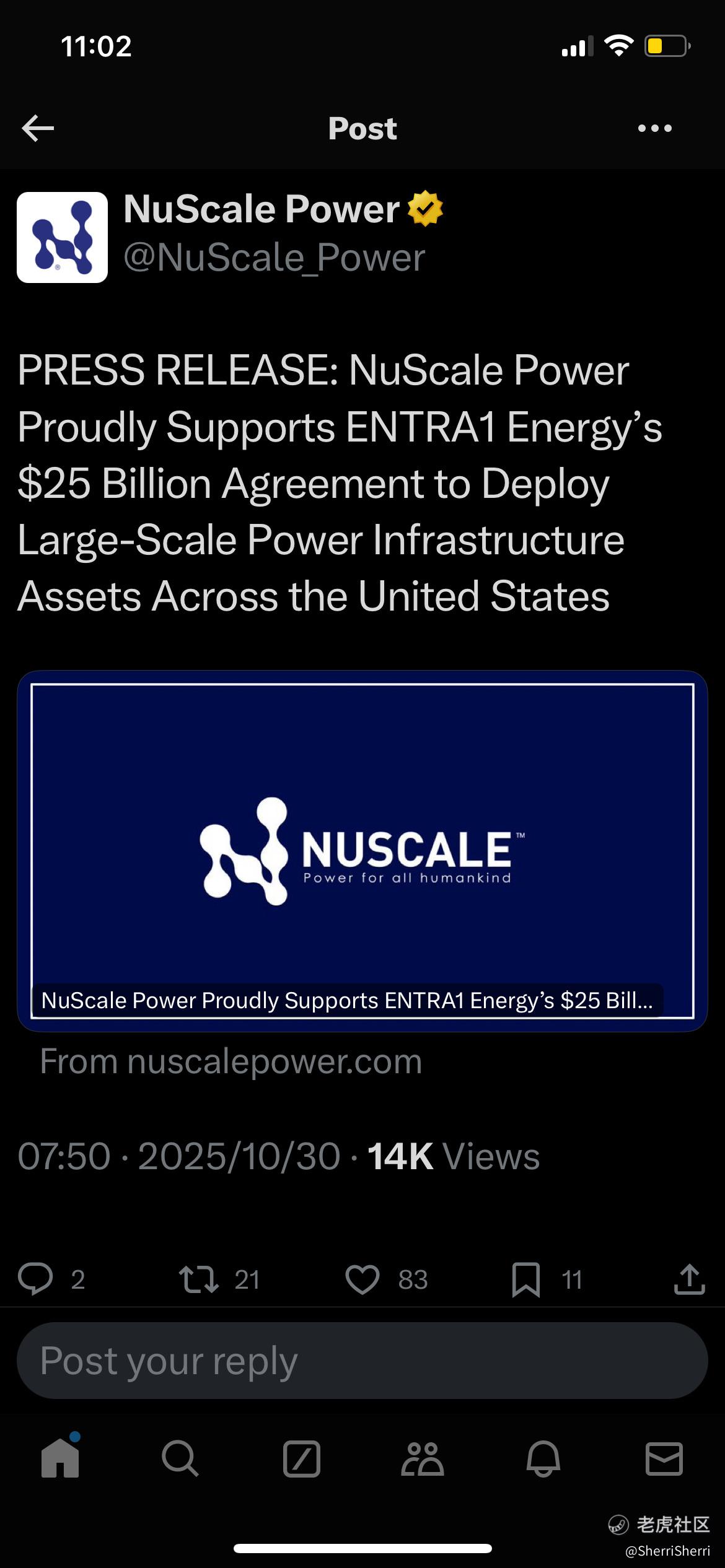 👉🏻【俄勒冈州科瓦利斯讯 – 2025年10月29日】全球领先的先进小型模块化反应堆(SMR)核技术提供商 NuScale Power Corporation(纽交所代码:SMR)今日祝贺其全球独家战略合作伙伴 ENTRA1 Energy,在新签署的总额5500亿美元的美日框架协议下,有望获得高达250亿美元的投资资金。
