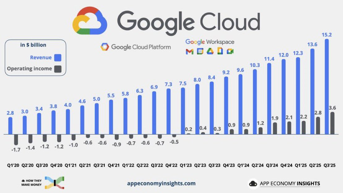 最关键的云服务Google Cloud的市场预期增速(~30%),尤其是买方预期(~32%)并不像 $微软(MSFT)$ 的Azure(约39%)那么夸张,因此给“超预期”留出空间,我个人认为主要受益于8月的Gemini更新,以及Nano Banana模型的全网风靡,也是自此之后Google Gemini的影响力有所提升;