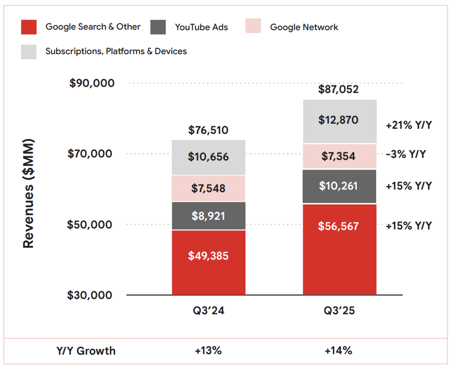 打破“AI对广告业务的影响”的担忧。虽然联盟广告下滑2.6%(占整体营收比例7%左右),也是AI转型必要的牺牲之一,但关键的搜索业务(市场认为会有所下滑)却不降反增14.6%,与整体收入的增速(包含GCP的33%)持平,这就很逆天了,叠加Youtube继续炸裂的表现,广告整体属于“大超预期”,自然就打破市场对“AI占据搜索业务市场影响业绩”的担忧了。