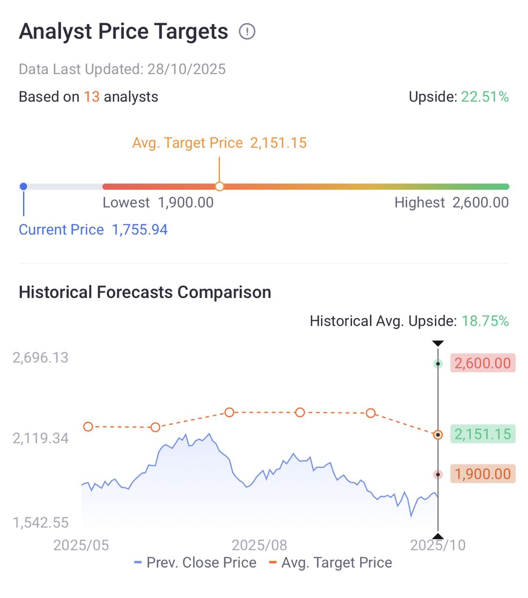 老虎国际APP综合呈现的多位分析师平均目标价显示,相较最新收盘价1755.94美元,平均上行空间为22.51%,目标价2151.15美元。