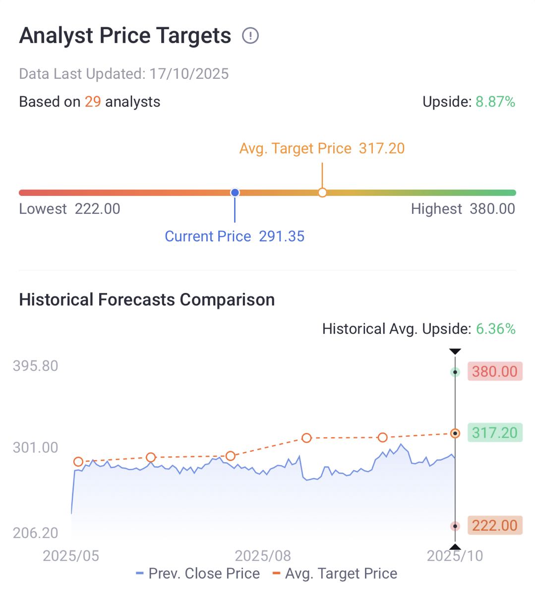 老虎国际APP综合呈现的多位分析师平均目标价显示,相较最新收盘价291.35美元,平均上行空间为8.87%,目标价317.2美元。