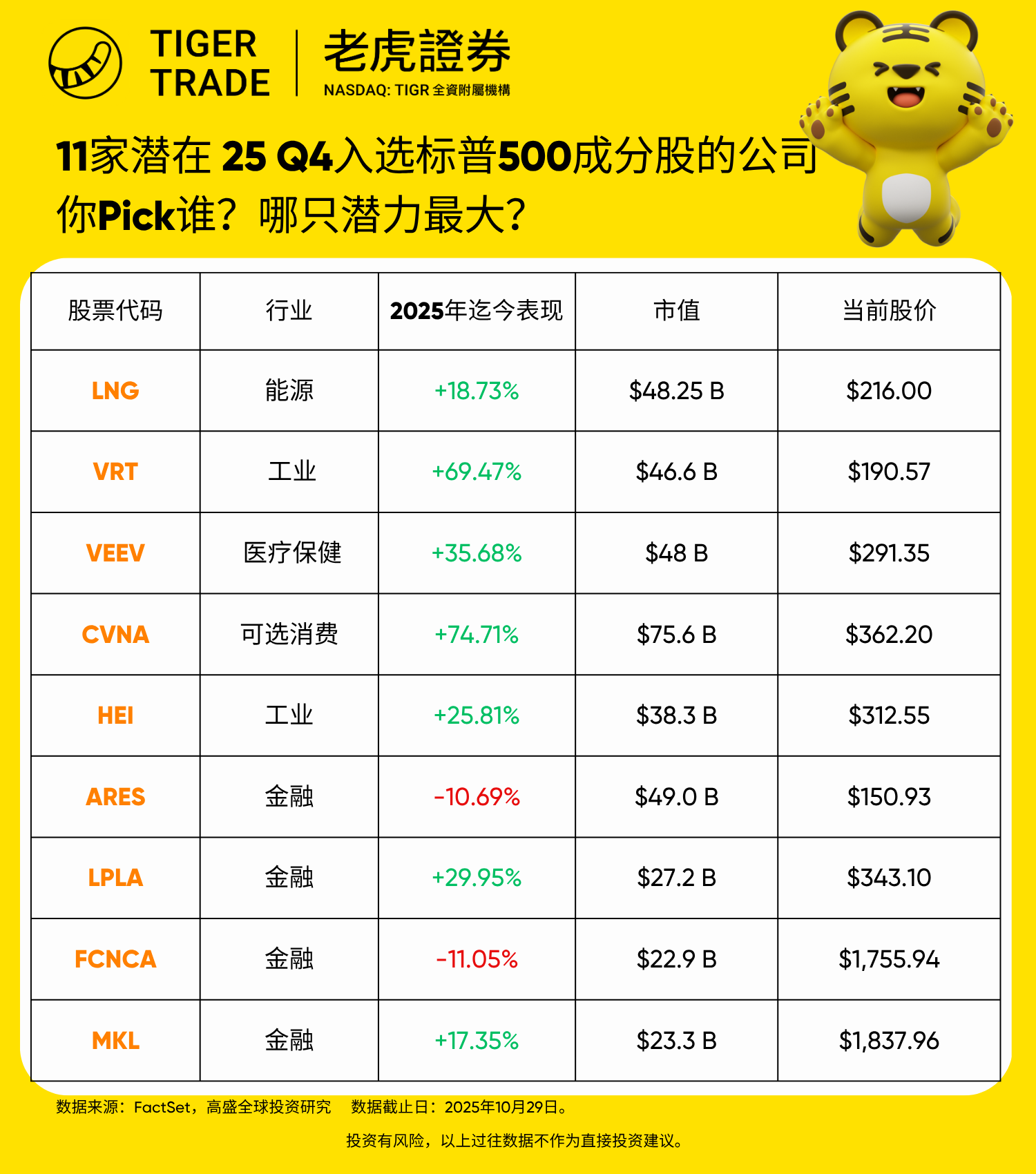 💰11家潜在入选标普500成分股公司:LNG、CAVA、TOST 等看涨两位数