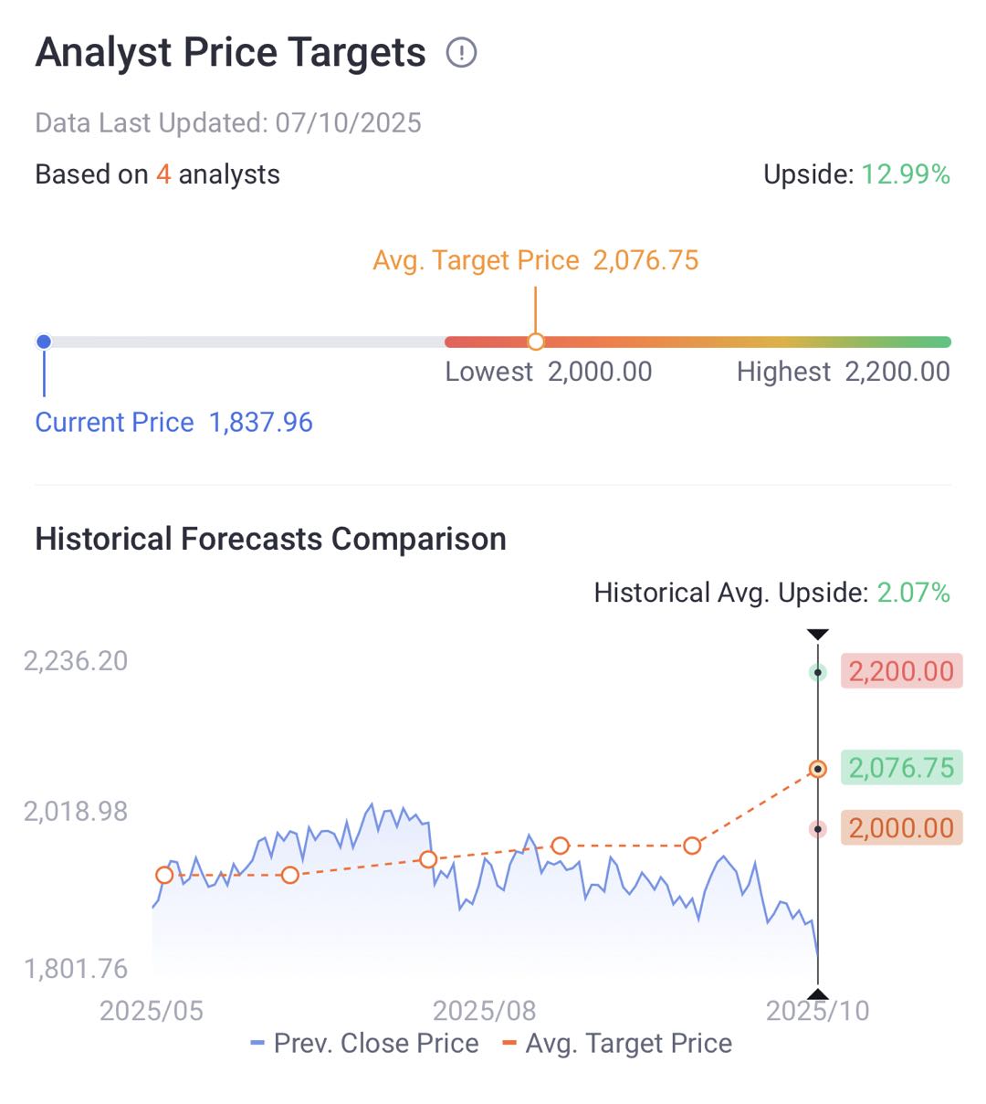 老虎国际APP综合呈现的多位分析师平均目标价显示,相较最新收盘价1837.96美元,平均上行空间为12.99%,目标价2076.75美元。