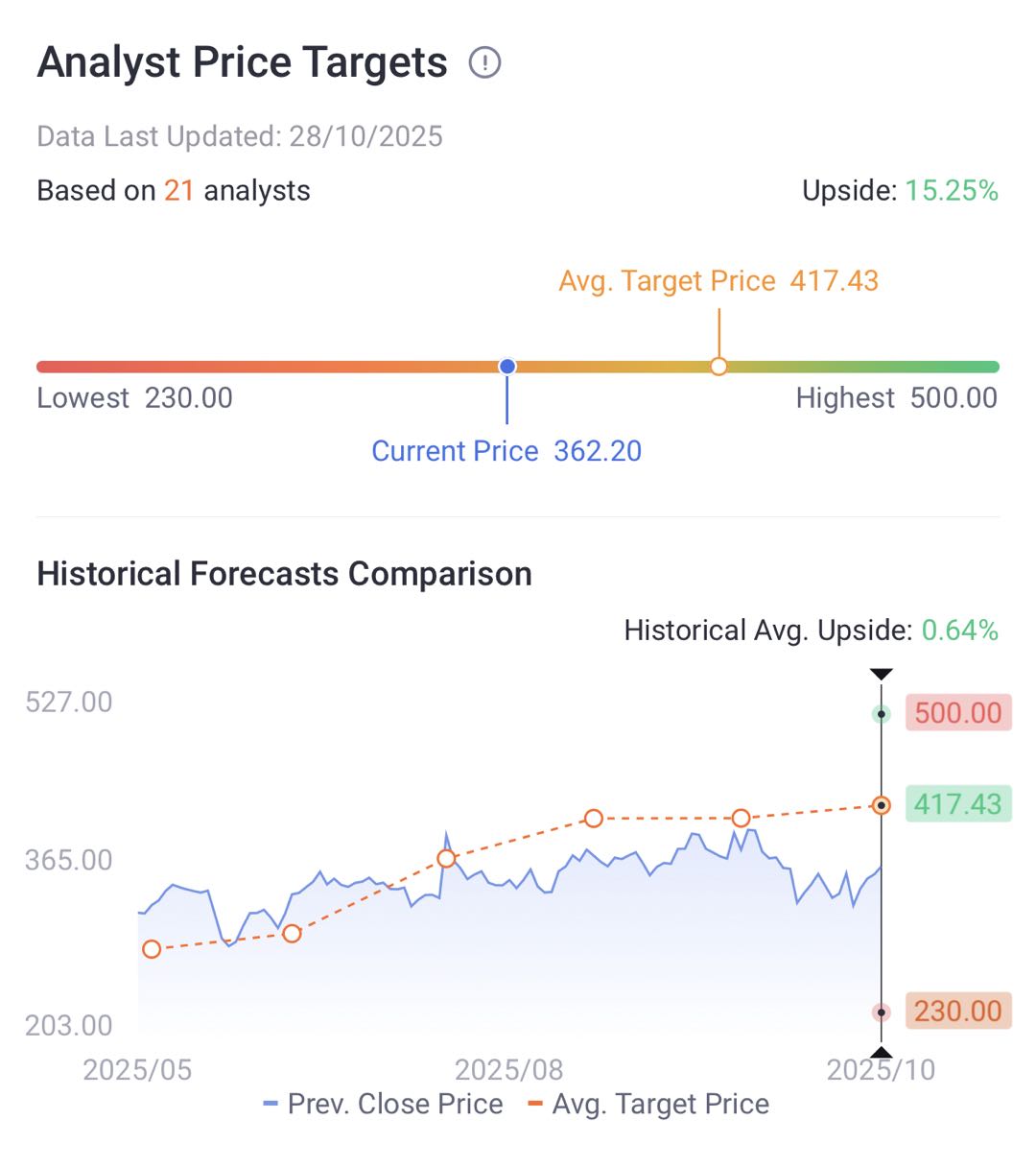 老虎国际APP综合呈现的多位分析师平均目标价显示,相较最新收盘价362.2美元,平均上行空间为15.25%,目标价417.43美元。