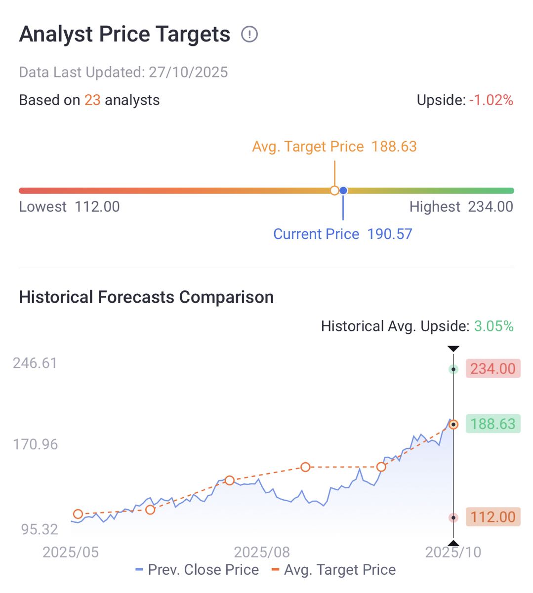 老虎国际APP综合呈现的多位分析师平均目标价显示,相较最新收盘价190.57美元,平均下行空间为1.02%,目标价188.63美元。