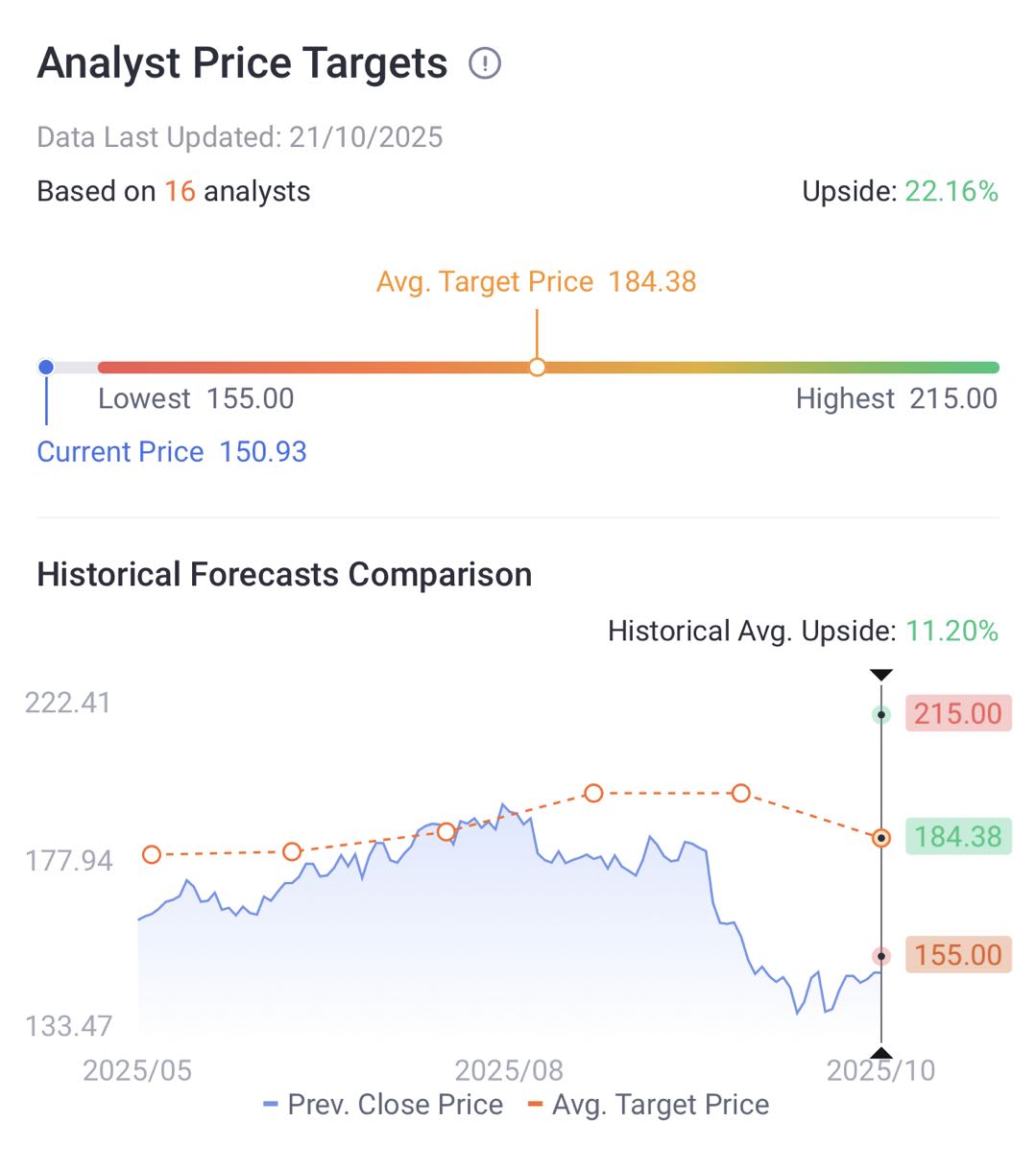 老虎国际APP综合呈现的多位分析师平均目标价显示,相较最新收盘价150.93美元,平均上行空间为22.16%,目标价184.38美元。
