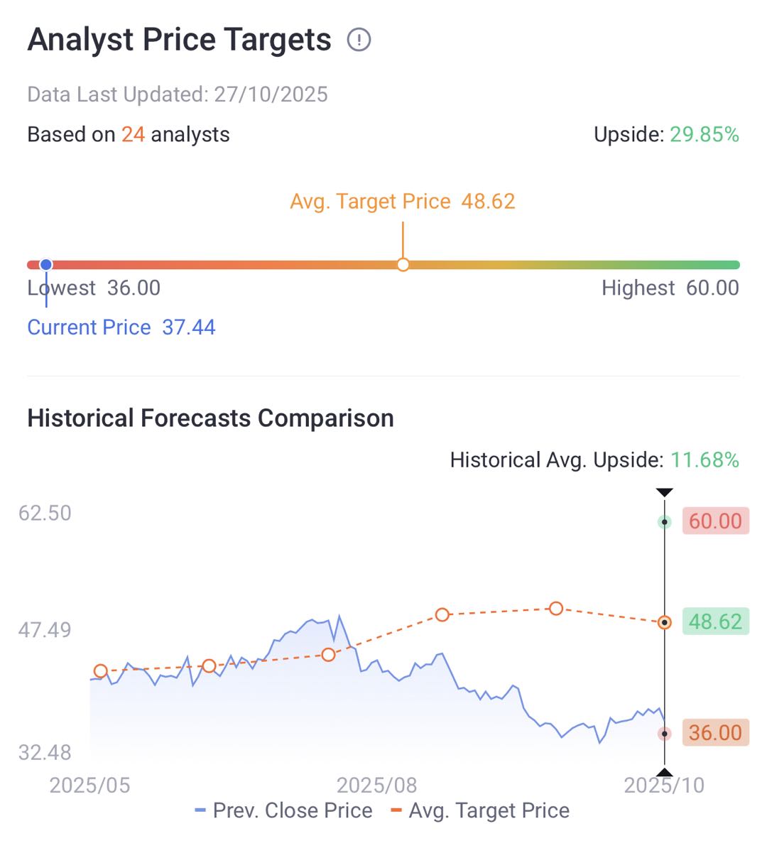 老虎国际APP综合呈现的多位分析师平均目标价显示,相较最新收盘价37.44美元,平均上行空间为29.85%,目标价48.62美元。