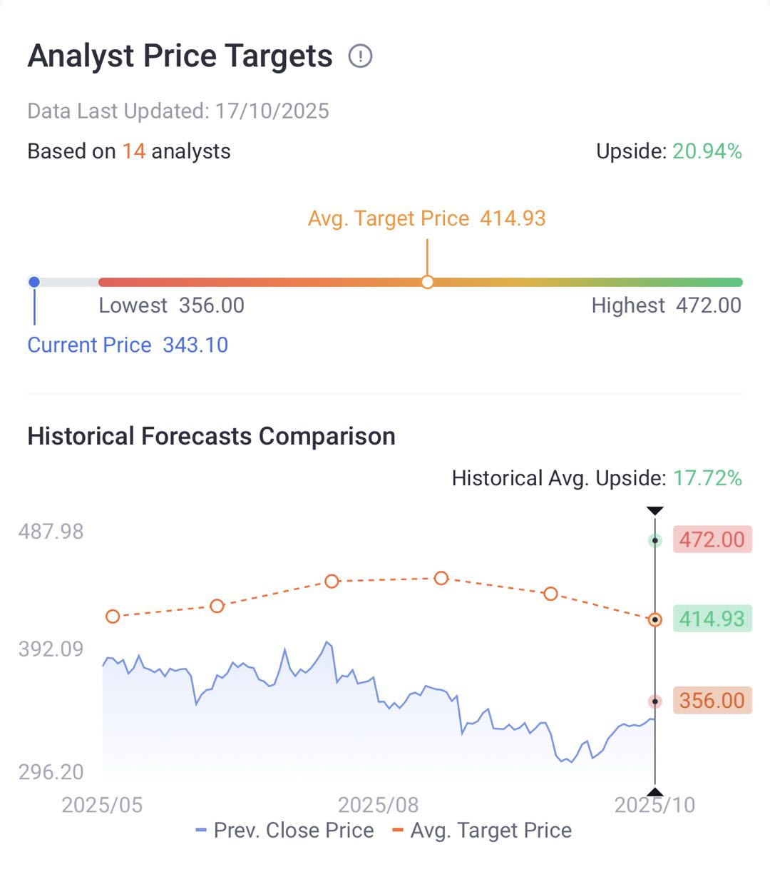 老虎国际APP综合呈现的多位分析师平均目标价显示,相较最新收盘价343.1美元,平均上行空间为20.94%,目标价414.93元。