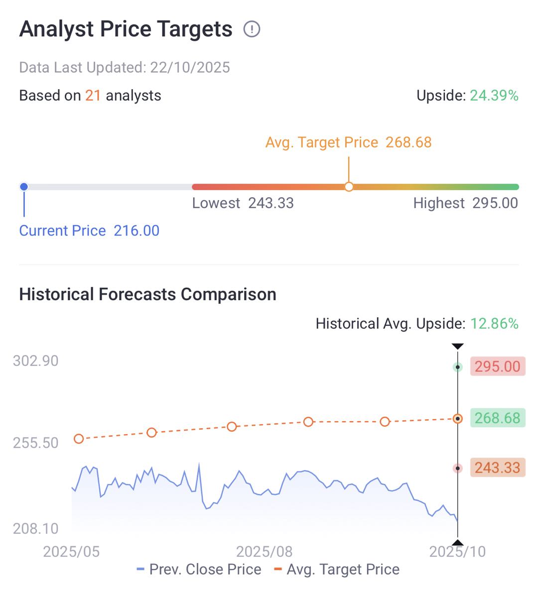 老虎国际APP综合呈现的多位分析师平均目标价显示,相较最新收盘价216美元,平均上行空间为24.39%,目标价268.68美元。