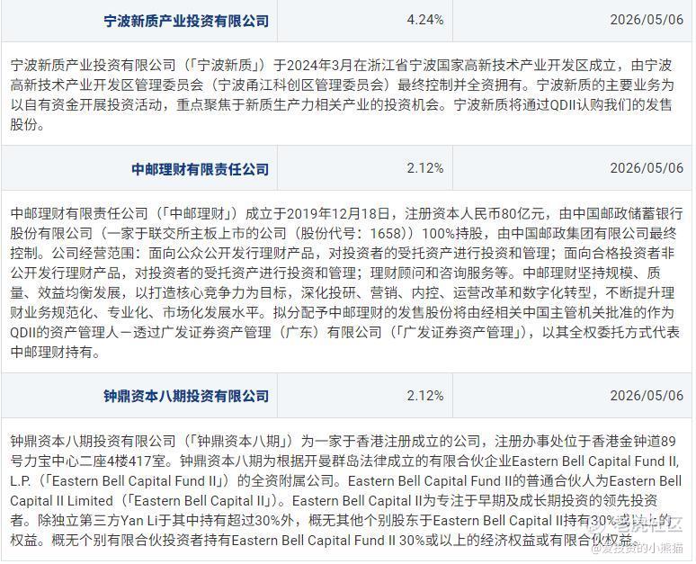 中国邮政集团旗下国有理财子公司,代表大型金融机构对智能汽车赛道的长期看好,资金性质稳健且具有战略协同性 。