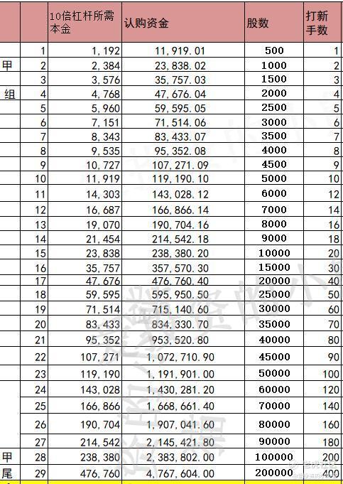 甲组的各档融资所需要的本金还有融资金额对应如下表: