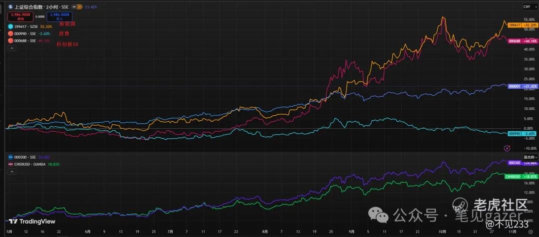 近六个月表现:上证、沪深300、A50涨幅都在20%关口一带,但消费的-2.6%(地产就无需再提),而新能源&科创50等科技含量高的都在50%左右···