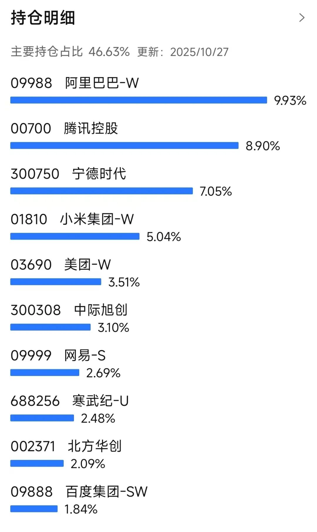 前十大持仓占比46.63%,其中港股6只,A股4只;既包含了阿里,腾讯,小米,美团,网易,百度这类港股互联网科技股,也包含了宁德时代,中际旭创,寒武纪,北方华创等A股科技股。