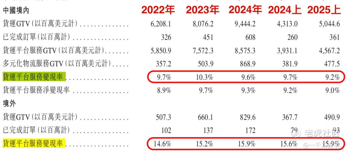未来趋势是佣金在内地货运平台服务收入中的占比逐步走高。但另一个值得关注的数据是变现率的下降,变现率是从订单交易GTV中获得平台收入的take rate比例,货拉拉的货运平台变现率在2022年、2023年、2024年及2025上半年分别为9.7%、10.3%、9.6%和9.2%,这与2024年公司调整变现策略导致收入增速低于GTV增速直接相关。