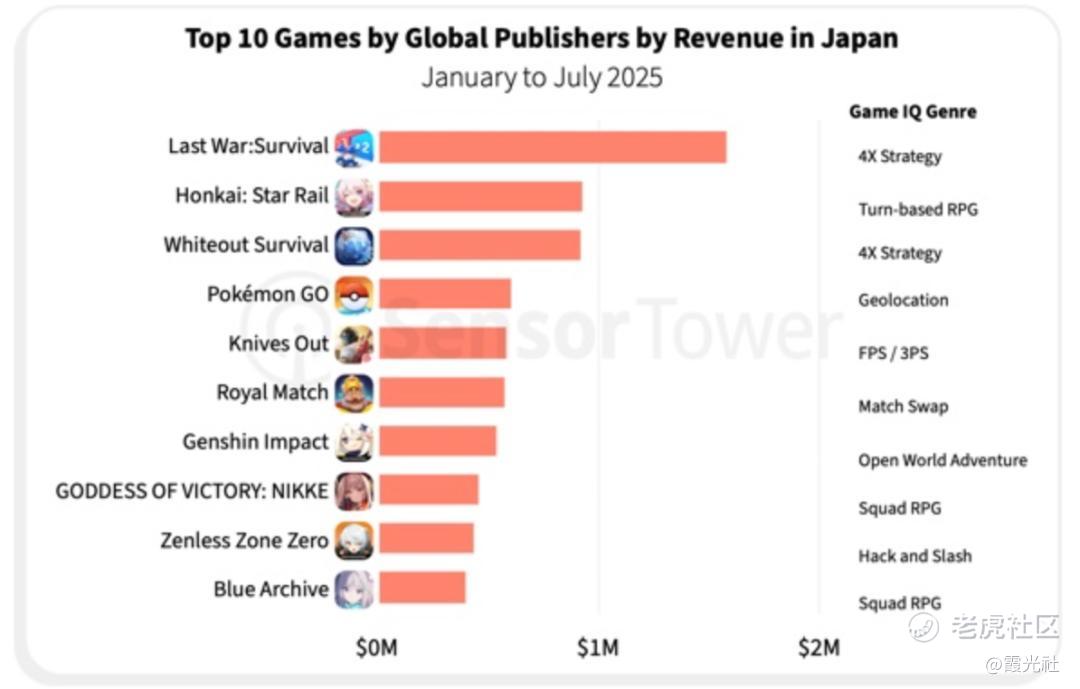 中国游戏厂商出海日本火热,也在更多维度被佐证。Sensor Tower近日发布的《2025年日本游戏市场洞察》报告显示,今年截至到7月,日本手游收入榜前十中,中国游戏占据了六席。同时,主机游戏方面,今年年初日本PS平台免费榜上中国产品也占据了一半。