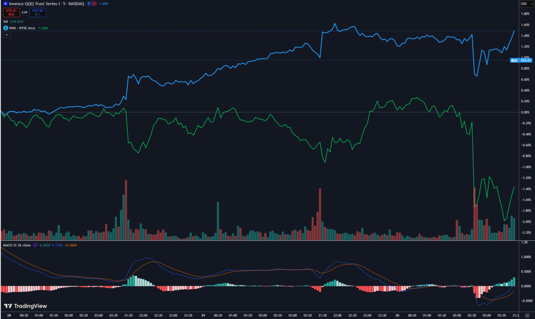 这个变化对于不同的资产,在当日的冲击是不同的,以股票来说,经济不错但利率不会走低,是一个喜忧参半的组合,当然这里我们说的是整体,在局部我们会看到,经济不错的代表是大公司,期待降息的是小公司,所以可以看到纳斯达克和罗素2000在今天的走势不同