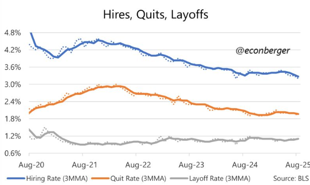 先从失业率说起,我们且不说大小公司的差异,就从整体去看,目前美国处在,招人少,辞职少,裁员少的组合
