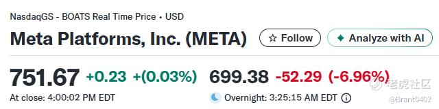 这意味着,Meta要“重金押AI”,但回报尚未可见。这让市场瞬间降温——股价盘后暴跌 6.96%,直接蒸发约4000亿美元市值。