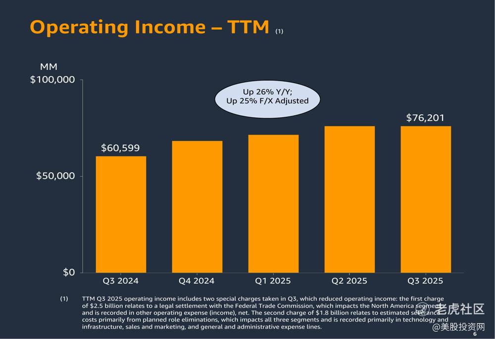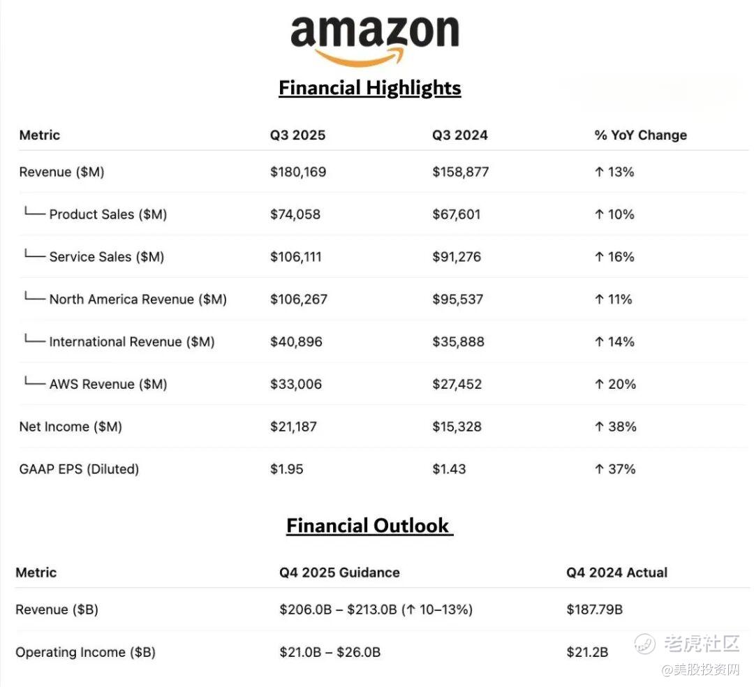 亚马逊第三季度净销售额增长13%至1802亿美元,超出市场预期的1778.2亿美元;净利润飙升至212亿美元,每股收益1.95美元,远高于分析师预期的1.58美元。剔除与FTC和解相关的25亿美元支出和裁员相关的18亿美元遣散费后,营业利润达217亿美元。这份业绩的亮点与增长动力集中在: