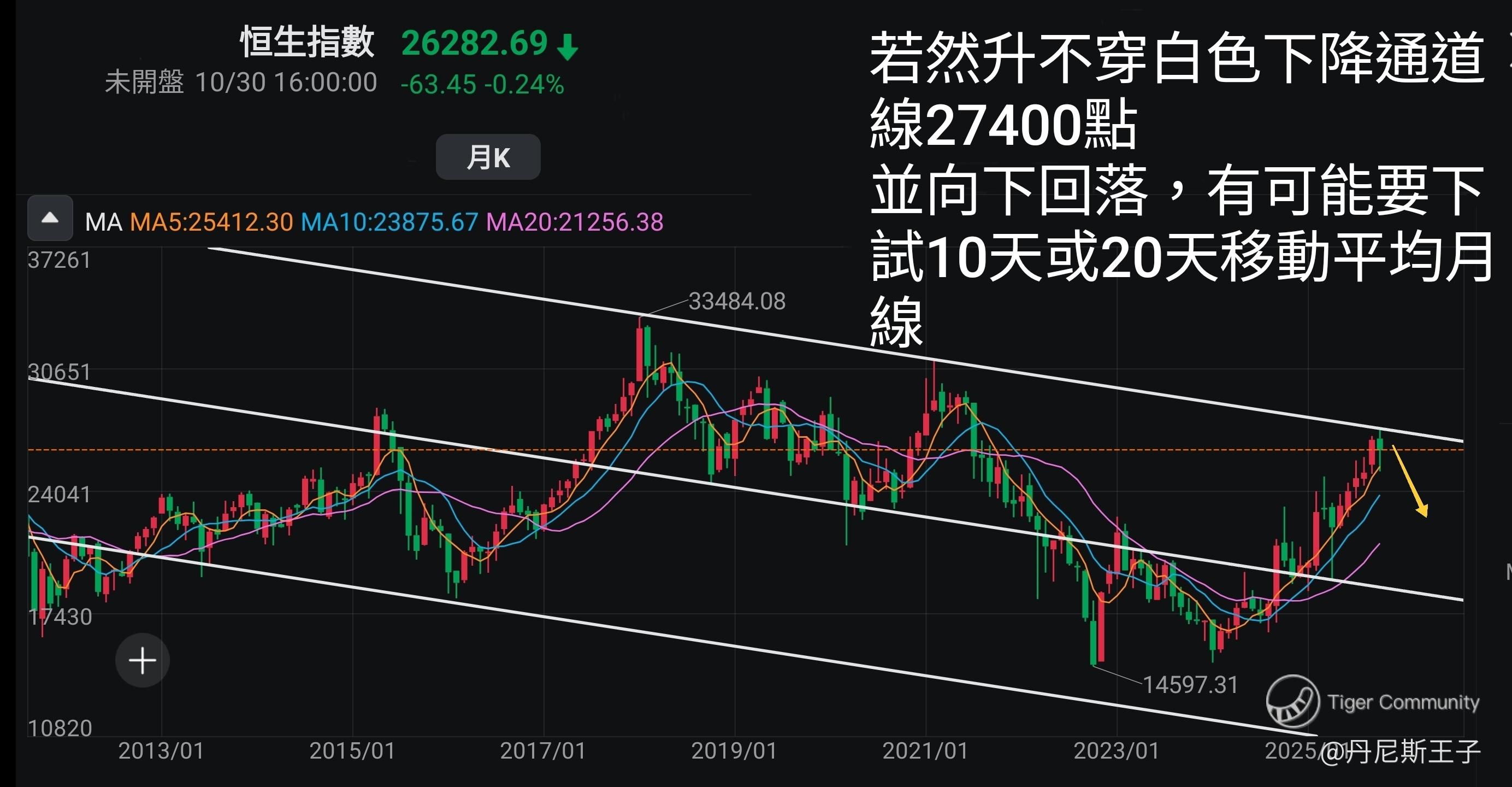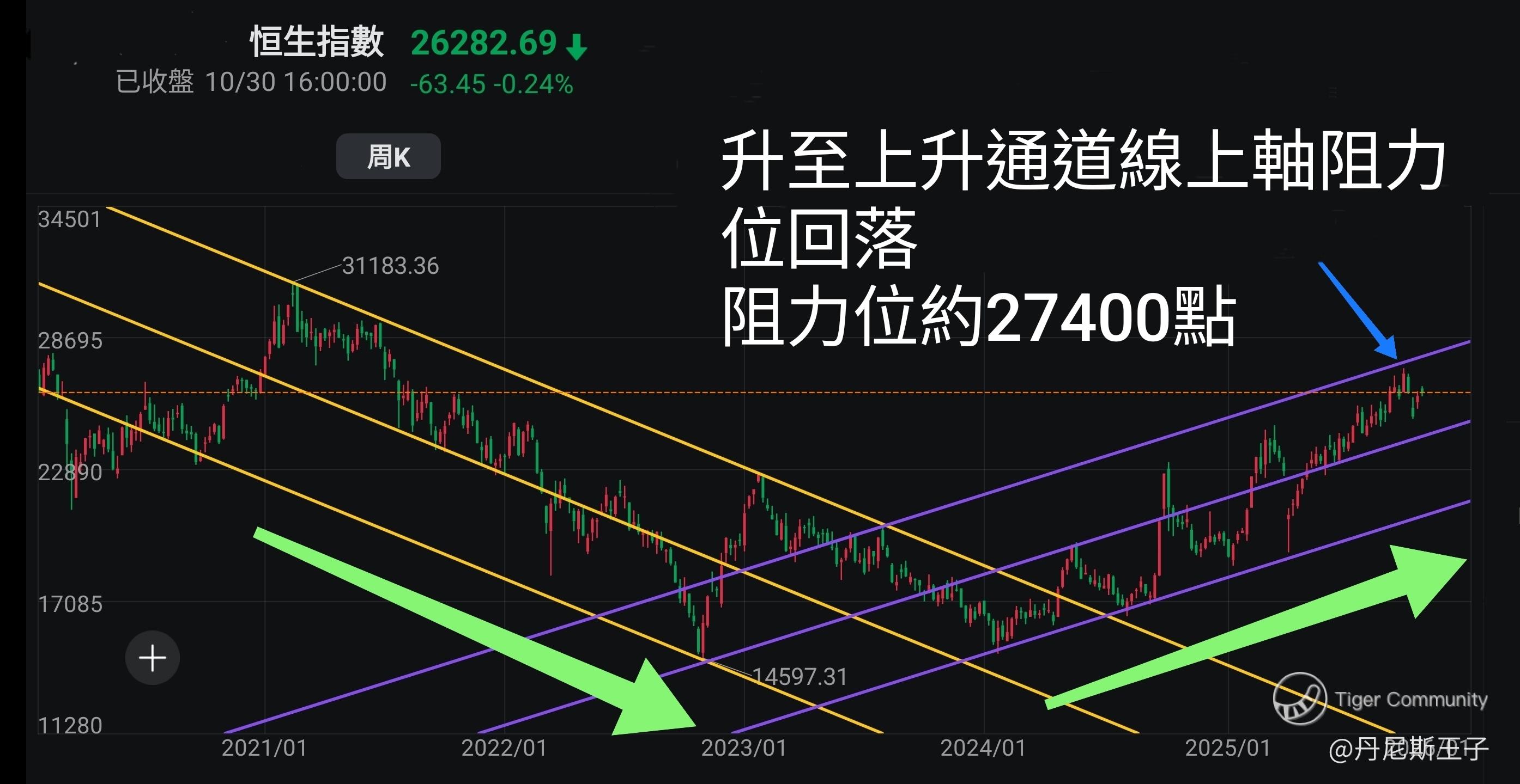 蓝色上升通道线下轴阻力位和白色下降通道线上轴阻力位(约26650点)