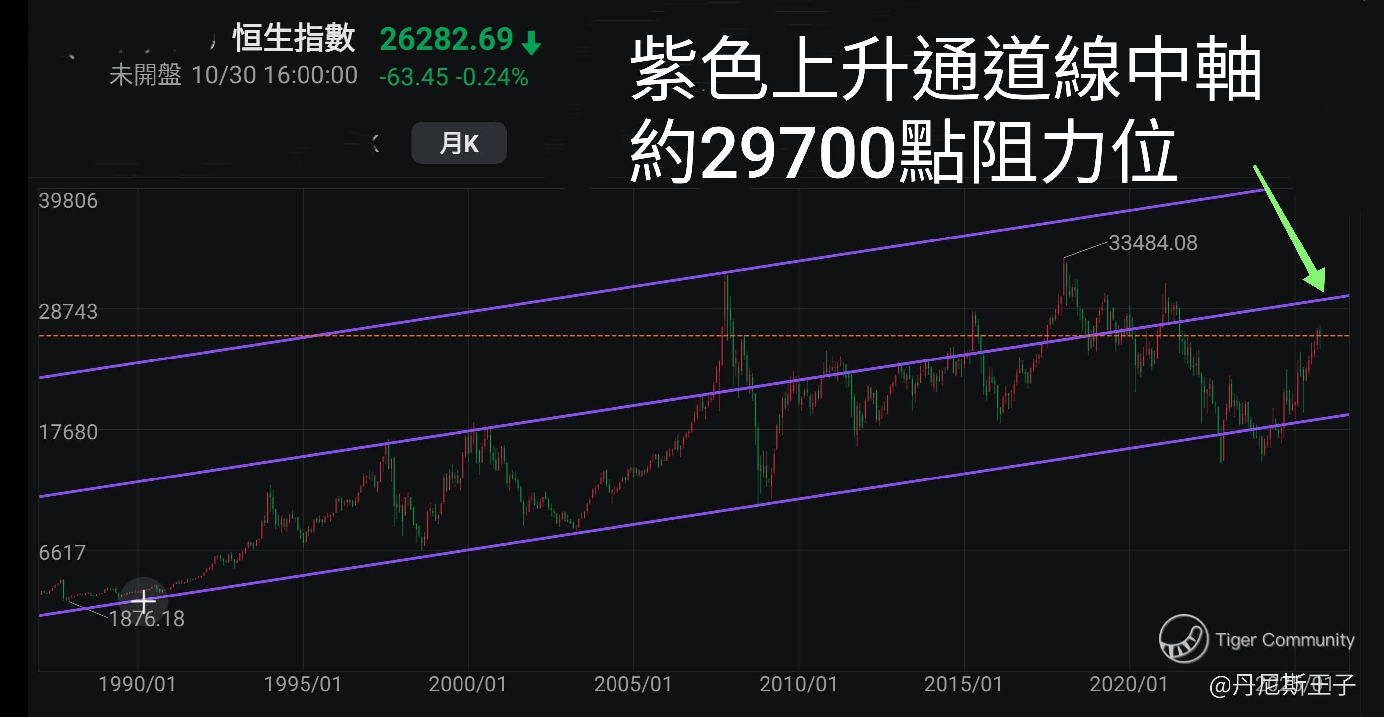(月线图:紫色上升通道线中轴阻力位29700点。)