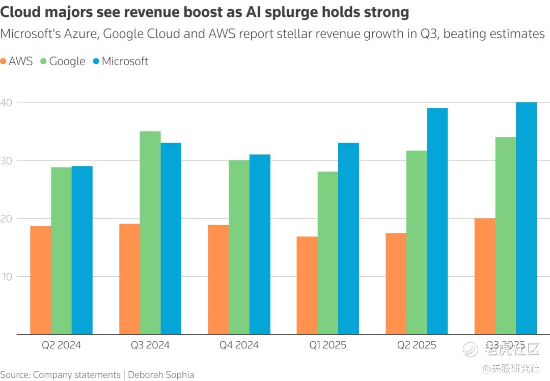 作为全球最大的云服务提供商,AWS本季度的强劲表现,紧随微软(Microsoft)和谷歌(Google)此前公布的亮眼业绩之后。微软旗下的Azure和谷歌云(Google Cloud)分别位列行业第二、第三,两者在周三均报告了出色的云业务增长。