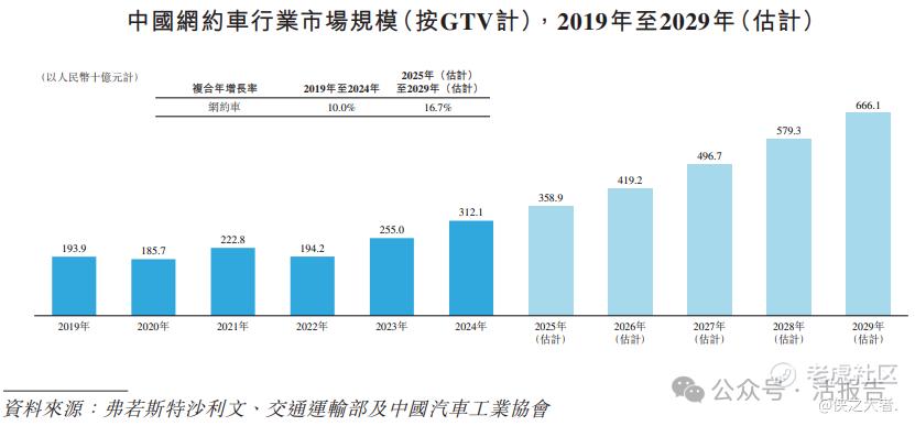 根据弗若斯特沙利文(Frost & Sullivan)的报告,按GTV计,中国网约车市场规模预计将从2025年的人民币3,589亿元增长到2029年的人民币6,661亿元,复合年增长率为16.7%。