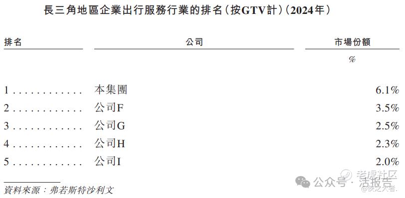 按GTV计,公司在2024年中国企业出行服务行业排名第二,市场份额为2.2%,公司在企业出行服务行业的五大市场参与者中拥有最多的外资企业客户。以GTV计,公司2024年在长三角地区企业出行服务行业位列第一。