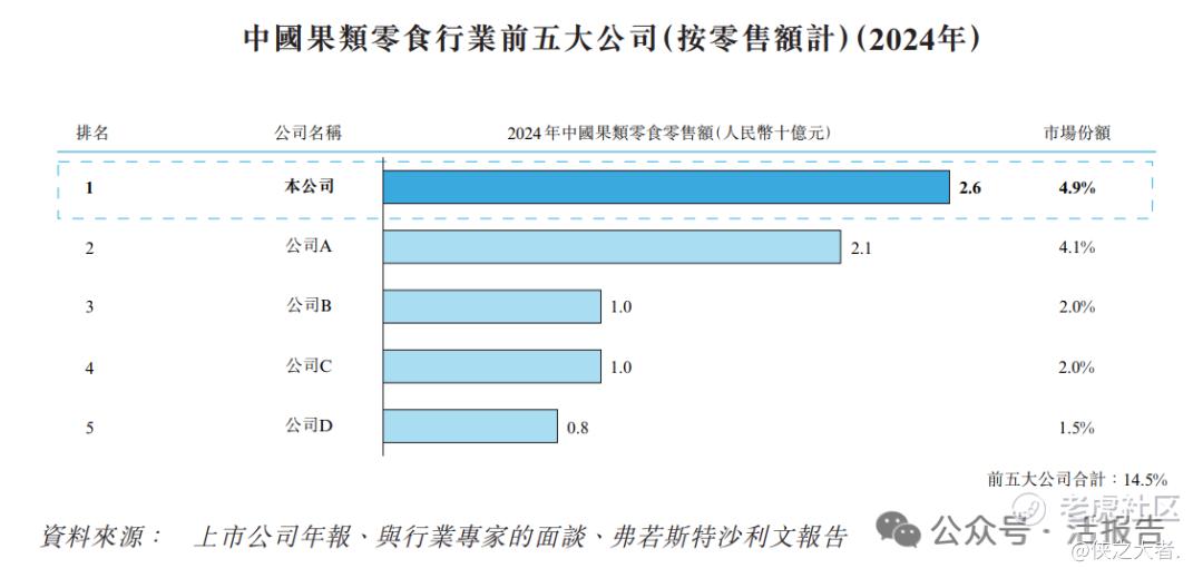 根据弗若斯特沙利文(Frost & Sullivan)的报告,于2024年,中国果类零食行业的市场规模(按零售额计)达到人民币520亿元,前五大市 场参与者占市场份额14.5%。于2024年,本公司在中国果类零食行业中排名第一(按零售额 计),市场份额为4.9%。