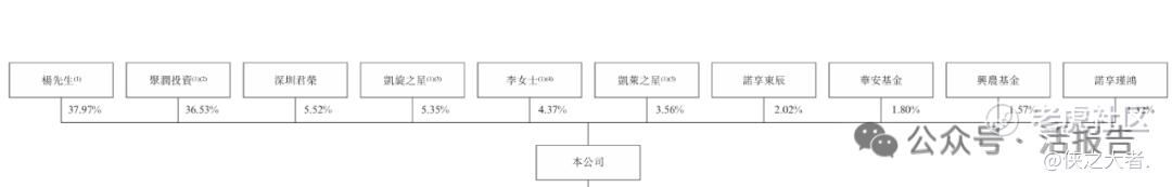 溜溜果园在上市前的股东架构中,控股股东杨帆先生、李慧敏女士、聚润投资、凯旋之星和凯莱之星等,合计持股约87.77%。(杨帆先生持股为37.97%,李慧敏女士持股为4.37%,聚润投资持股为36.53%,凯旋之星持股为5.35%,凯莱之星持股为3.56%)。