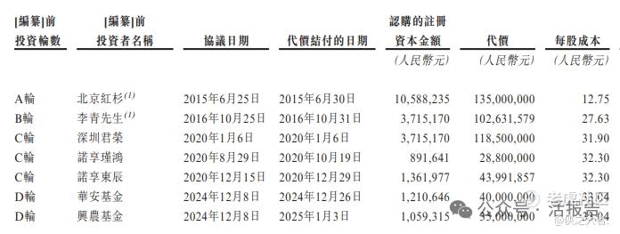 公司于2015年至2025年进行过四次上市前融资,累计融资5.04亿人民币。按2025年1月的最新D轮融资看,每股成本33.04元,即公司上市前估值约为22.25亿人民币(约23.67亿港元)。