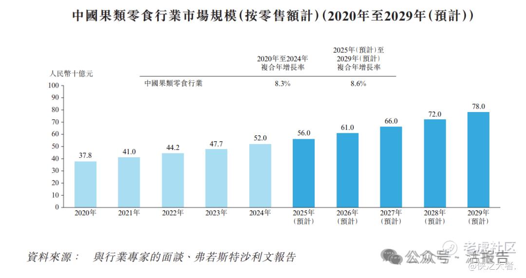 根据弗若斯特沙利文(Frost & Sullivan)的报告,中国果类零食行业的市场规模(按零售额计)由2020年的人民币378亿元增至2024年的人民币520亿元,复合年增长率为8.3%,预计 市场规模将于2029年达到人民币780亿元,2025年至2029年的复合年增长率为8.6%。