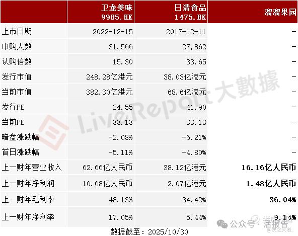 同行业IPO可比公司有:卫龙美味(9985.HK)、日清食品(1475.HK)