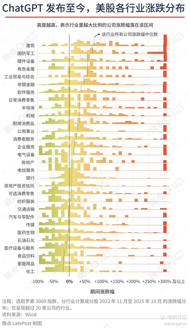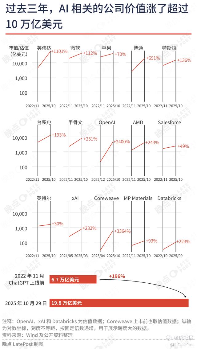 2022 年 11 月底 ChatGPT 上线前夕,英伟达还只有 4000 亿美元市值。之后近三年,美国资本市场与 AI 密切相关的公司价值就增加了 10 多万亿美元,相当于整个 A 股的总市值。