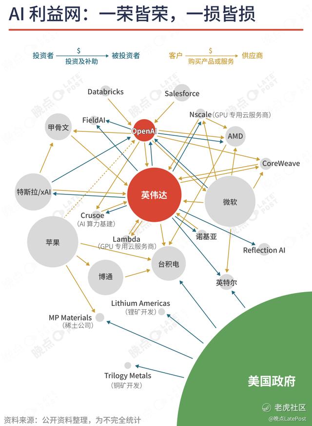 泡沫不是一天吹成的。三年里,多方不断押注,以订单和股权交易相互连接,不断结成了更大利益共同体。参与的企业从 OpenAI、英伟达扩散到几乎全部科技巨头,扩散到 AI 的上下游,从数据中心、软件服务再到电力、铜矿和稀土。AI 被赋予的意义也从创造商业价值变成国家间的决胜武器。