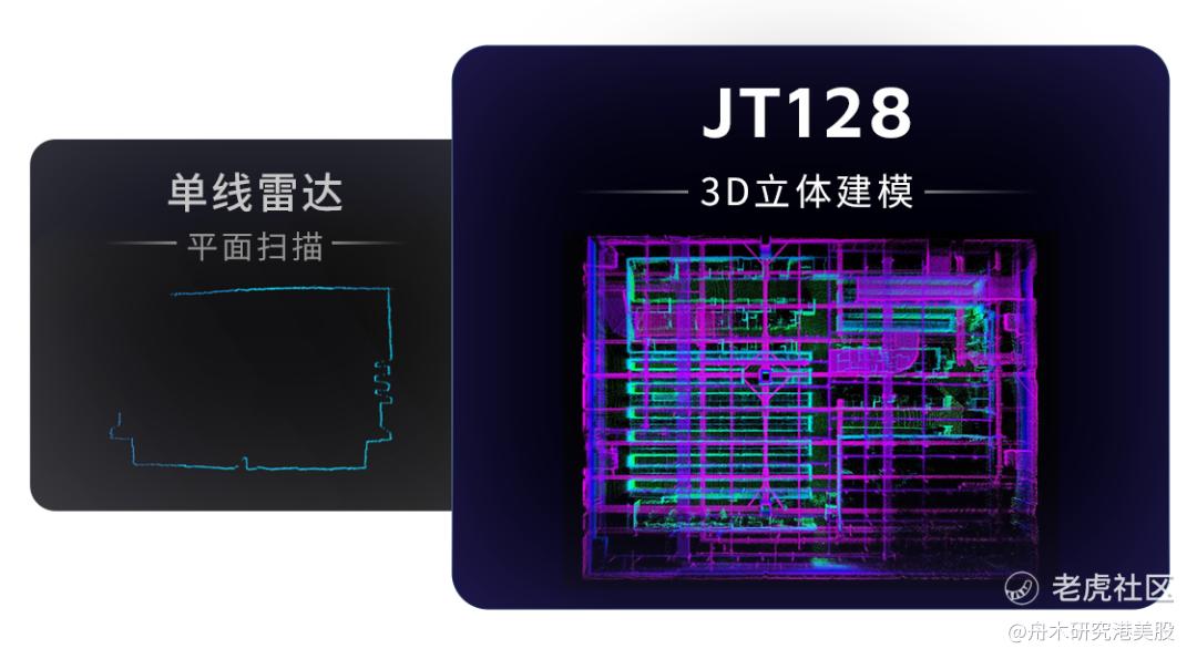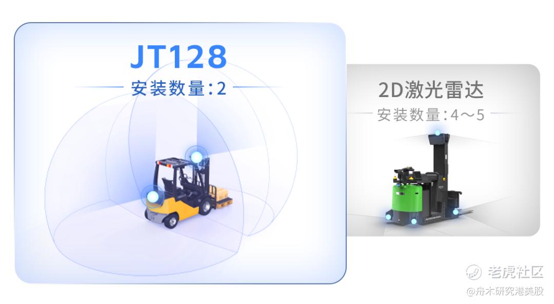 两台 JT128 即可实现叉车四周全向无死角覆盖,不仅减少硬件采购支出,更通过导航避障一体化设计,显著降低系统集成复杂度。