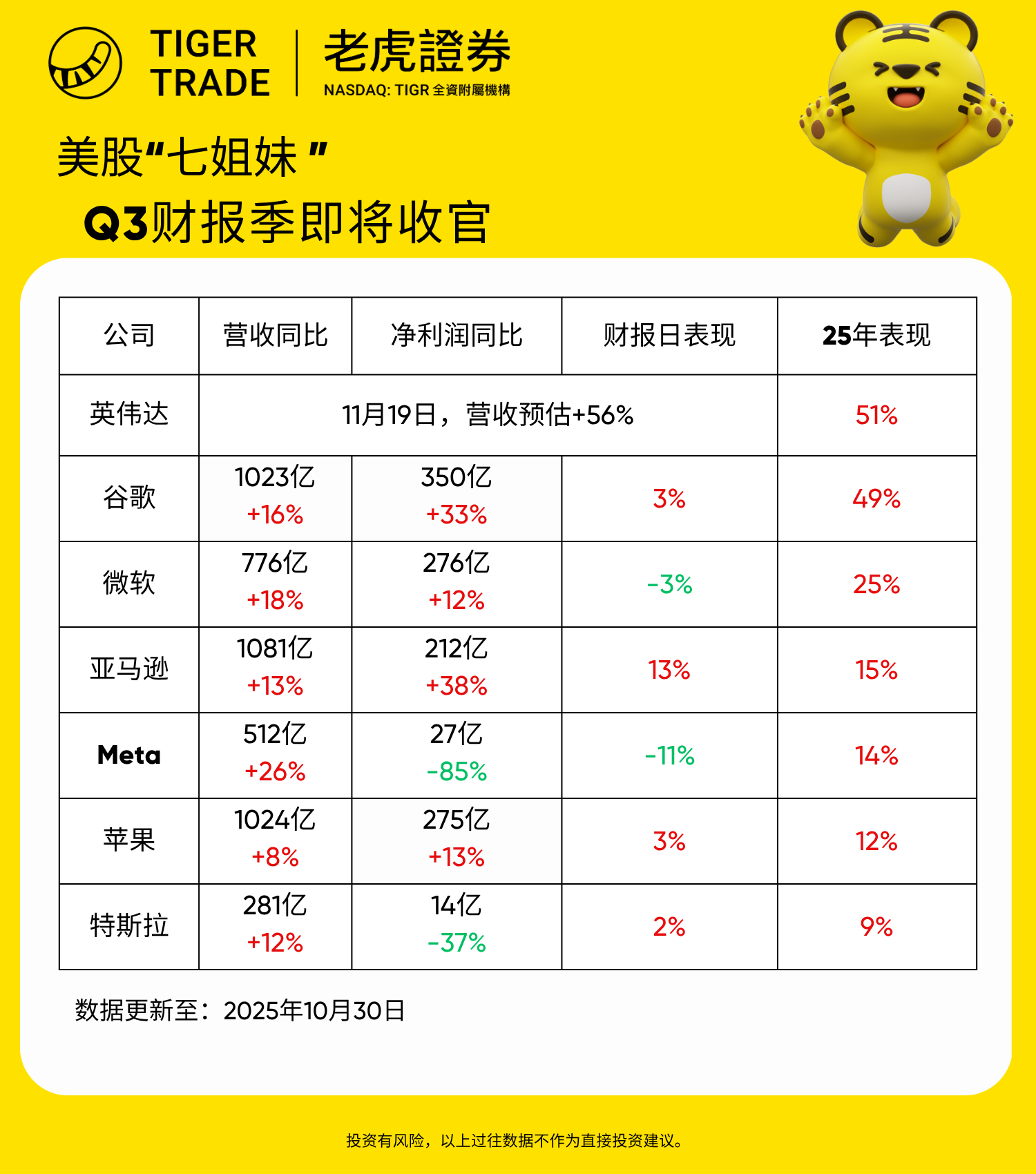 截止目前,除英伟达以外的6家都陆续公布了Q3数据,2025年到目前为止,七姐妹的平均收益为25%,表现最佳的是英伟达&谷歌: