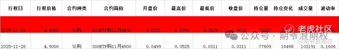 (1)沪深300ETF(沪)期权:11月最大持仓范围4700-4800,今收4.756,下跌1.39%。期权11月主力合约,认购以增仓为主,集中在4700-5750,合5.6W张;认沽有增有减,但量都不大。市场又开始在认购有分歧,变化超过1W张的仓位如下,红色是增仓较大的。