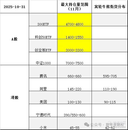 下图是今天大A的3个ETF和中证1000,以及港股的腾讯、阿里、美团、宁德和小米的最大持仓量范围以及窝轮牛熊分布范围,也就是11月的期权筹码分布,黄色的表示跟上个交易日有变动。