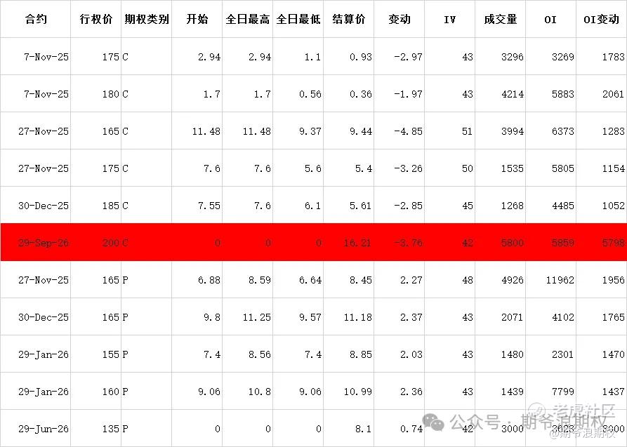 (2)阿里:11月最大持仓范围145-220,窝轮牛熊街货分布110-190,今收165.1,下跌4.07%。期权盘路变化超过1000张的仓位如下,红色是增仓较大的,26年9月200购大增5700张。总体来说,市场对阿里偏乐观。