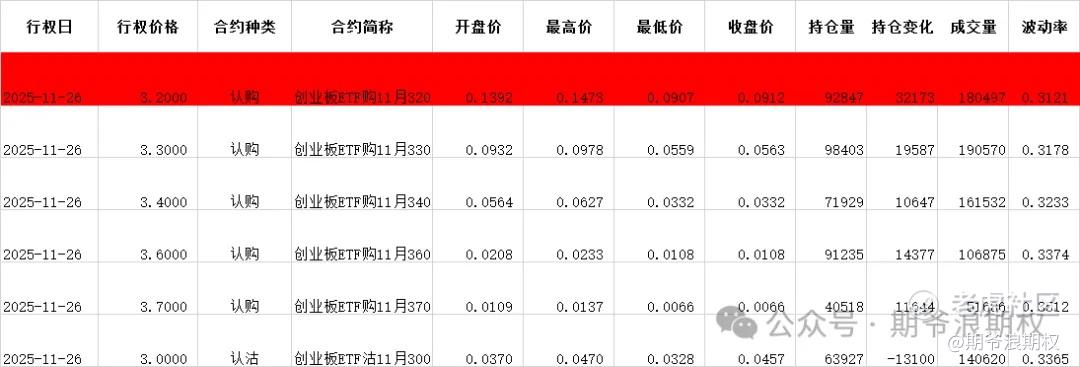 (3)创业板ETF期权:11月最大持仓范围3000-3300,今收3.166,下跌2.25%。期权11月主力合约,认购全部都是增仓,集中在3000-3700,合计10.5W张;认沽3000减仓1.3W张,增仓集中3200-3500,合计1.9W张。市场在认购上有分歧,总体偏乐观。变化超过1W张的仓位如下,红色是增仓较大的。