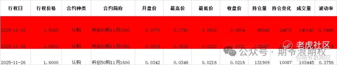 (2)科创50ETF:11月最大持仓范围1400-1550,今收1.488,下跌3.06%。期权11月主力合约,认购是以增仓为主,集中在1500-1800,合计8.3W张;认沽是低行权价增仓高行权价减仓,增仓集中在1250-1400,合计1.2W张,减仓集中在1450-1650,合计1.7W张。市场整体继续看多,但仍然谨慎。变化超过1W张的仓位如下,红色是增仓较大的。