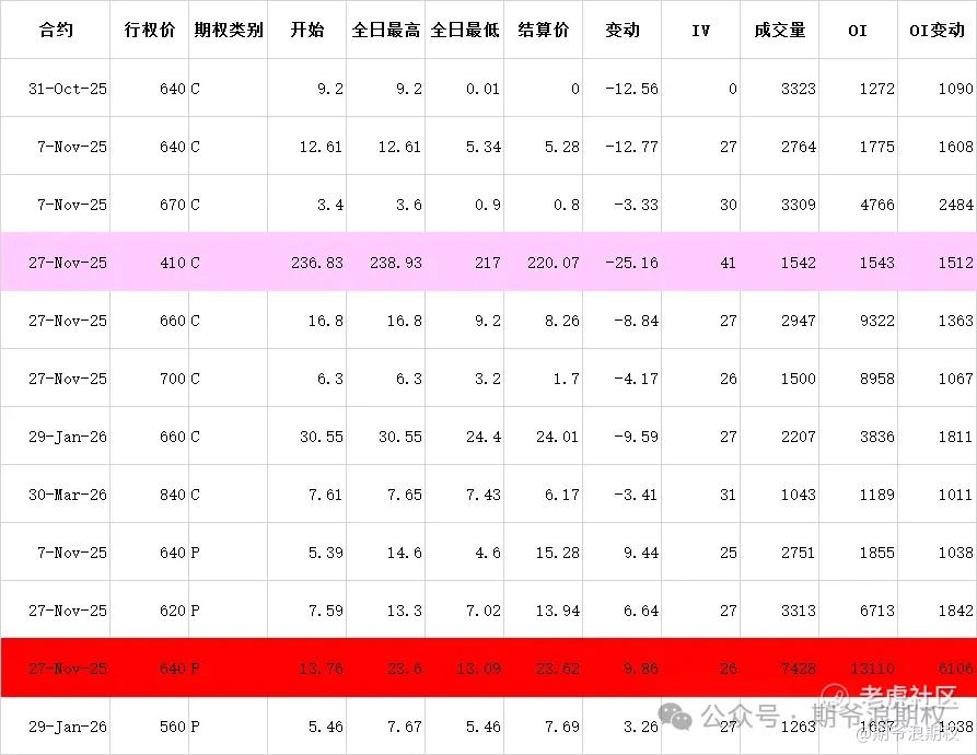(1)腾讯:11月最大持仓范围660/600-660,窝轮牛熊街货分布595-705,今收629.0,下跌3.36%。期权盘路变化超过1000张的仓位如下,红色是增仓较大的,粉色是深度实值增仓11月410购增仓1500张,有大佬用深度实值购抄底。有喜有忧,大佬们还是以做多的仓位为主。