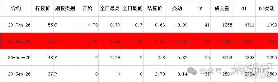 (5)小米:11月最大持仓范围52.5-55,窝轮牛熊街货分布42-62,今收43.2,下跌2.17%。期权盘路变化超过1000张的仓位如下,红色是增仓较大的,26年3月55购大增7400张。无论是远月还是近月,55都是多方的一个目标,早晚的事情。
