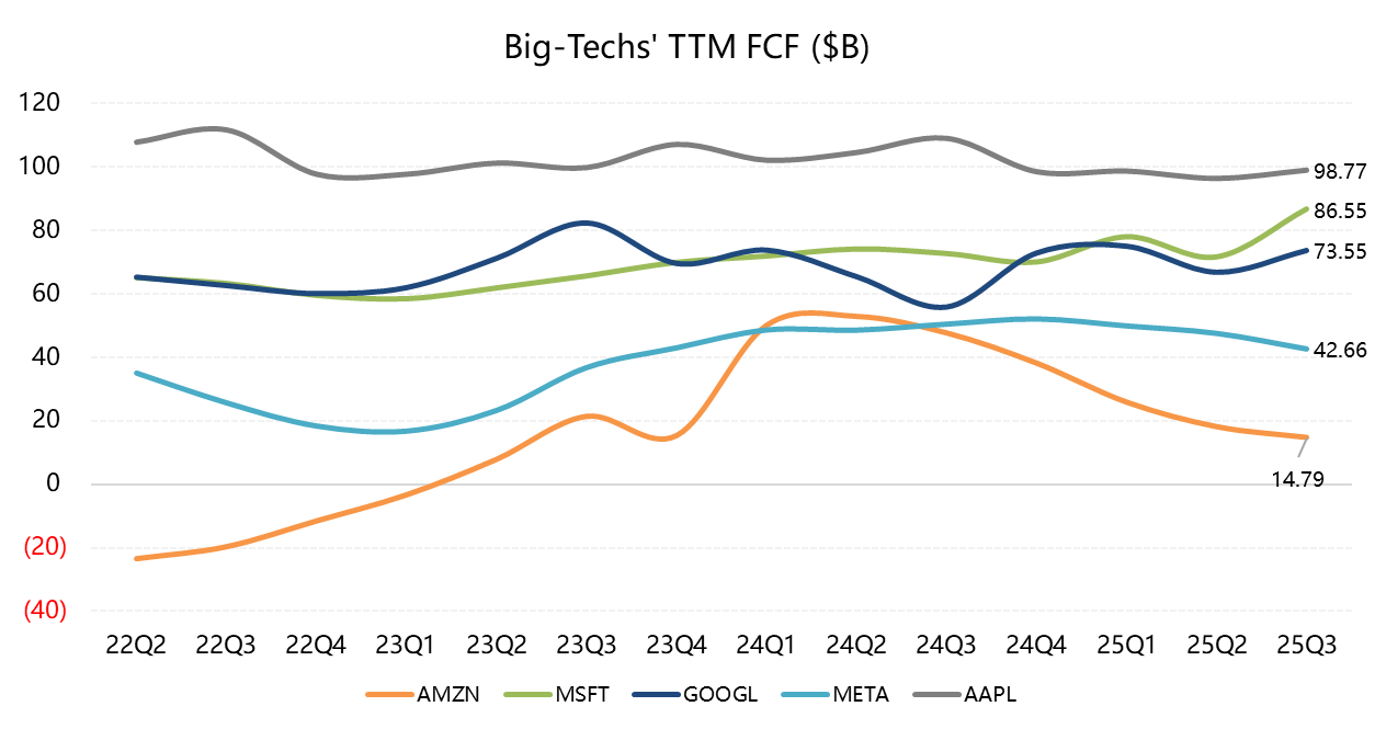 截至25Q3的财报,各家公司的过去12个月的FCF分别为: