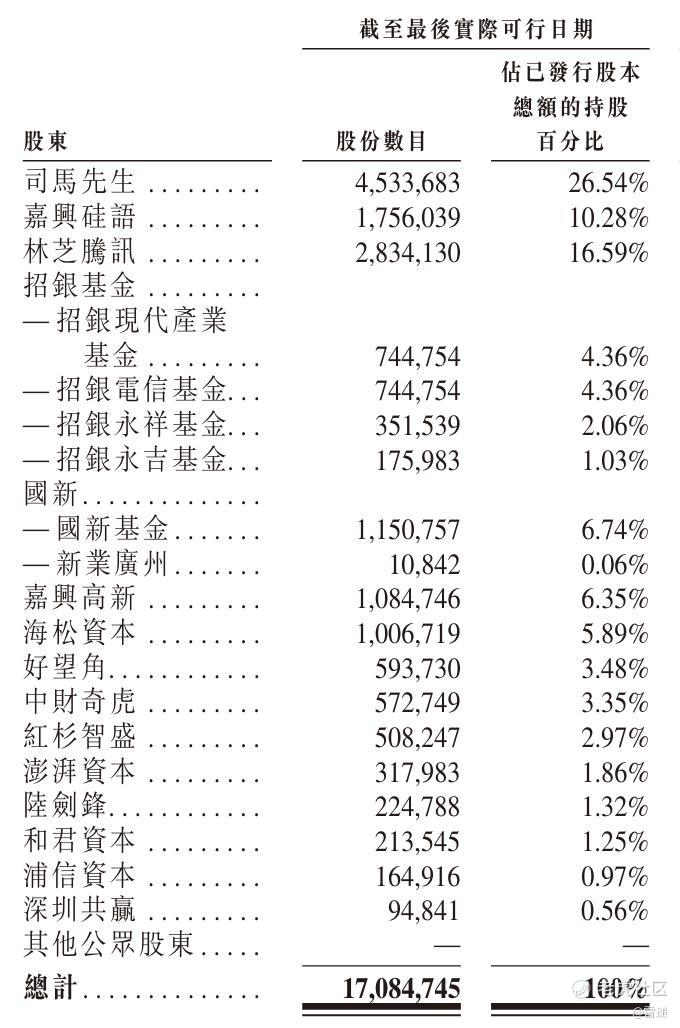 IPO前,司马华鹏持股为26.54%,嘉兴硅语持股为10.28%,林芝腾讯持股为16.59%,招银现代产业基金持股为4.36%;