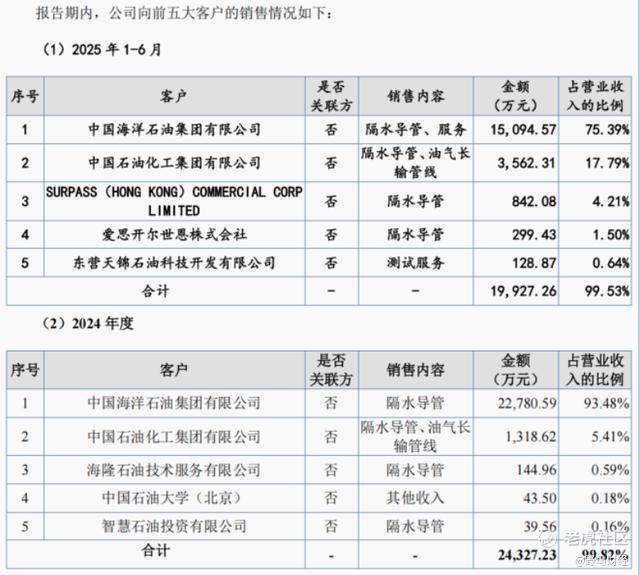 前五大客户中,中海油长期稳居第一客户,除此之外,“三桶油”之一的中石化也是公司五大客户之一,不过其收入较小,远不及中海油的收入贡献。报告期内,公司前五大客户均超过99%,2024年更是高达99.82%,客户结构极度集中。