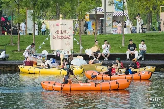 在杭州的拱墅运河体育公园,还有独一无二的“流水甜品席”正在水面上演。大家划着皮划艇,在水上寻找摊位兑换甜品和咖啡,不少用户在体验后感慨:“太会整活儿了”、“堪称是大型真人版本的曲水流觞”。